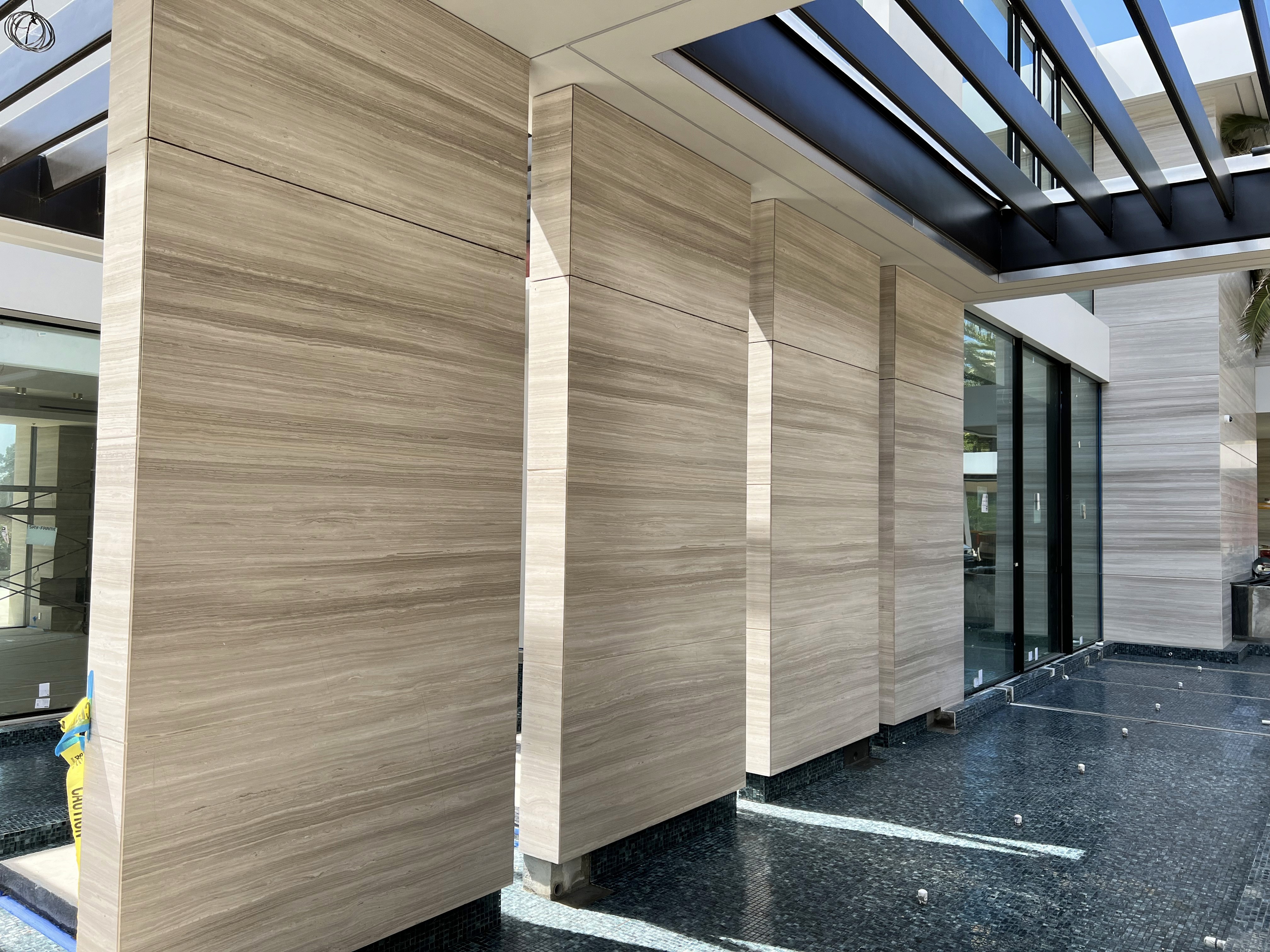 Our team member executed the exterior cladding for this ultra-luxury private villa, using large-format White Wooden Vein Limestone and Manchu Caviar Limestone panels installed via a precision stone curtain wall system.