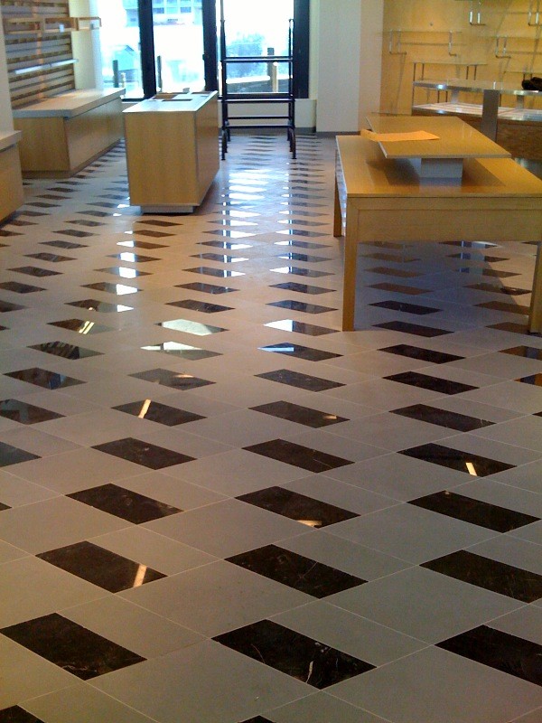 The contrast of deep, veined black and creamy, luminous white creates a striking visual rhythm, balancing modern edge with timeless luxury. Every tile was meticulously placed by our artisans to ensure seamless flow, resulting in a one-of-a-kind foundation that elevates the store’s sophisticated aesthetic.